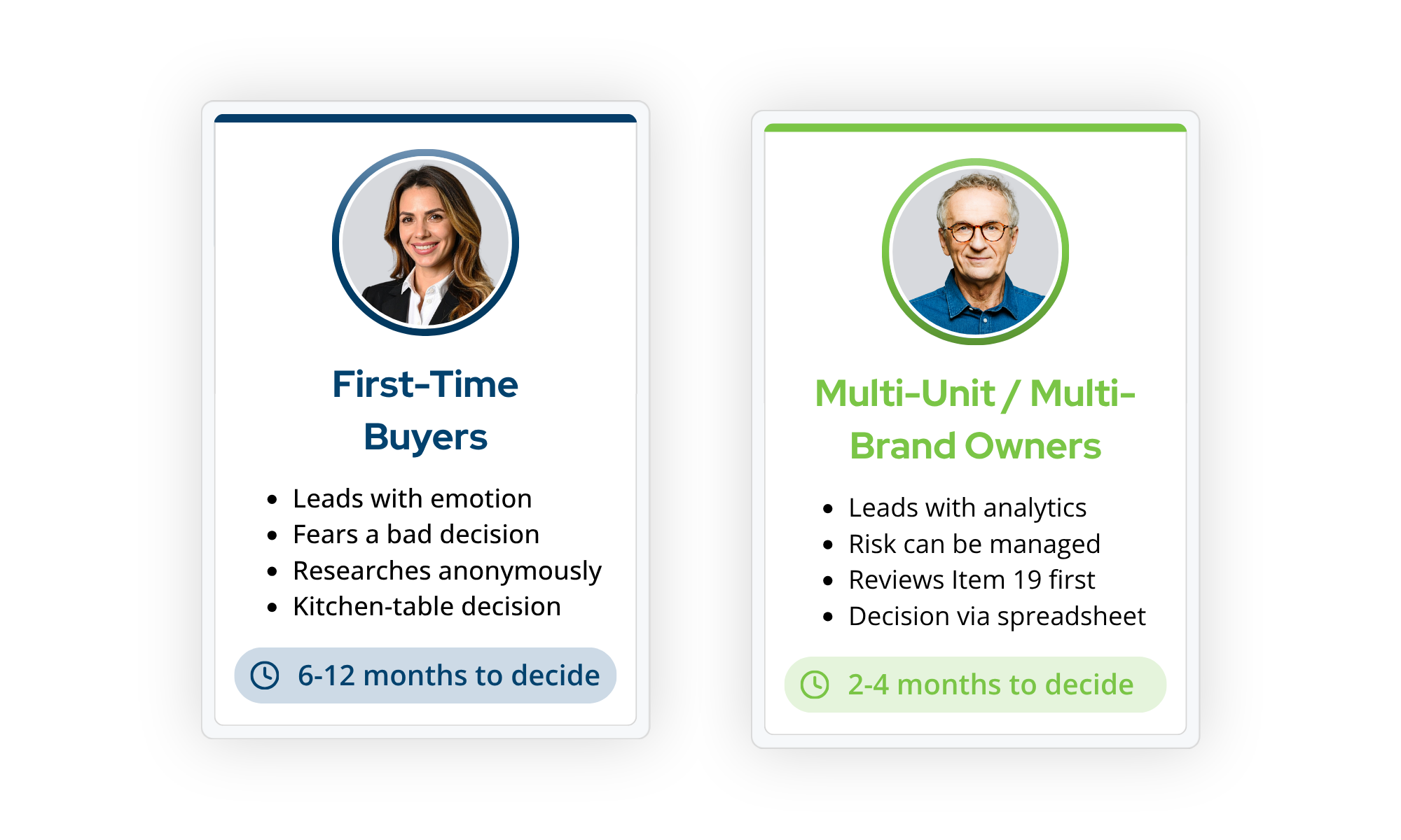 Inside each profile — first-time buyer and multi-unit operator — are distinct personas with different motivations, financial profiles, and research patterns. A corporate refugee fleeing burnout needs a different message than a retiree building an encore career. A private equity buyer reading Item 19 at 8am operates nothing like the multi-brand mogul who already has six territories.